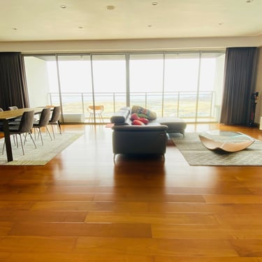 Large open living/dining area with large balcony overlooking the Ocean and Port City